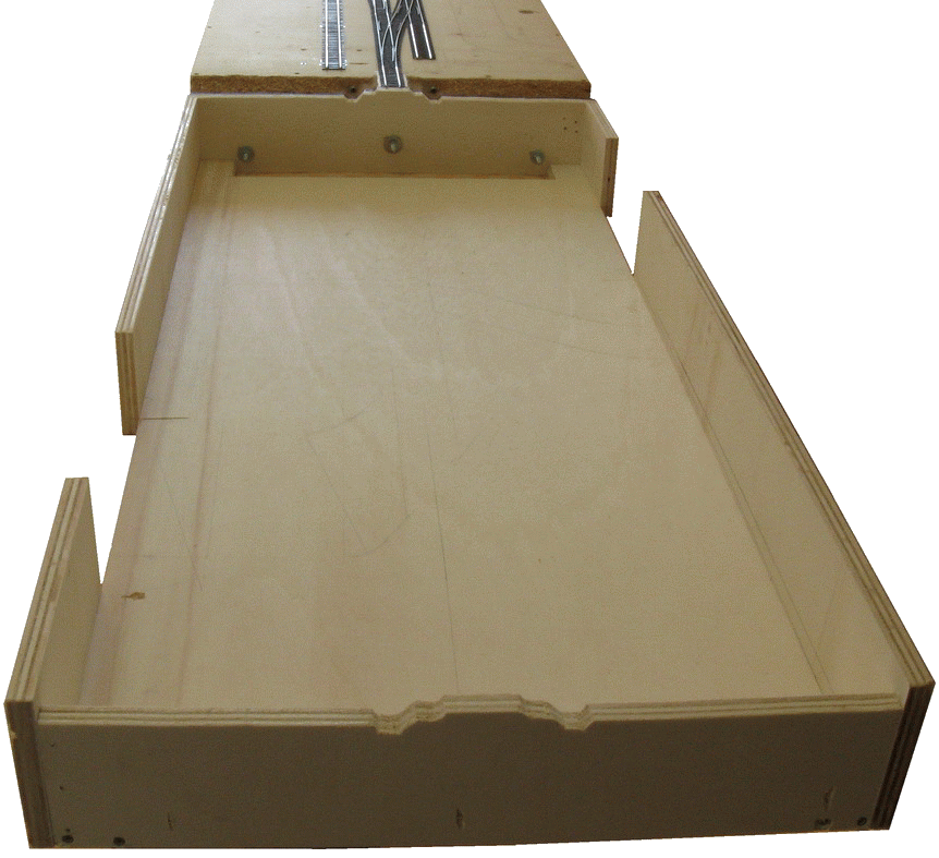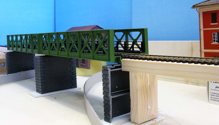Il modulo è attraversato dalla linea ferroviaria che sorpassa il canale con un ponte a travata metallica superiore. Il ponte scelto è quello prodotto da Roco. Un listello di legno sorregge la linea che attraversa tutto il modulo. Due strisce di cartone da 1,8 mm di spessore segnano il percorso del canale tra le sponde opposte del modulo.