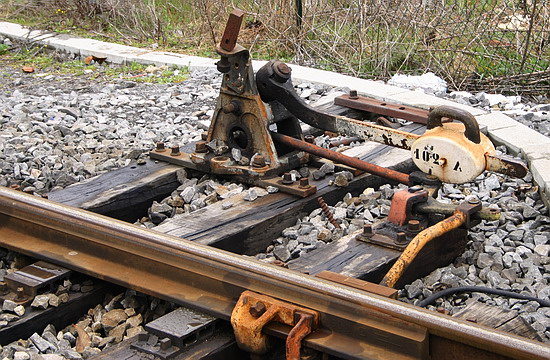 Quello della foto sottostante, invece, comanda il deviatoio attraverso un rinvio a 90°, in questo caso anche il macaco è montato sulle traverse longitudinalmente al binario, mentre l'altro è montato trasversalmente.