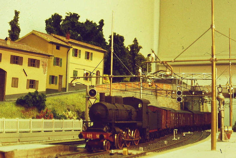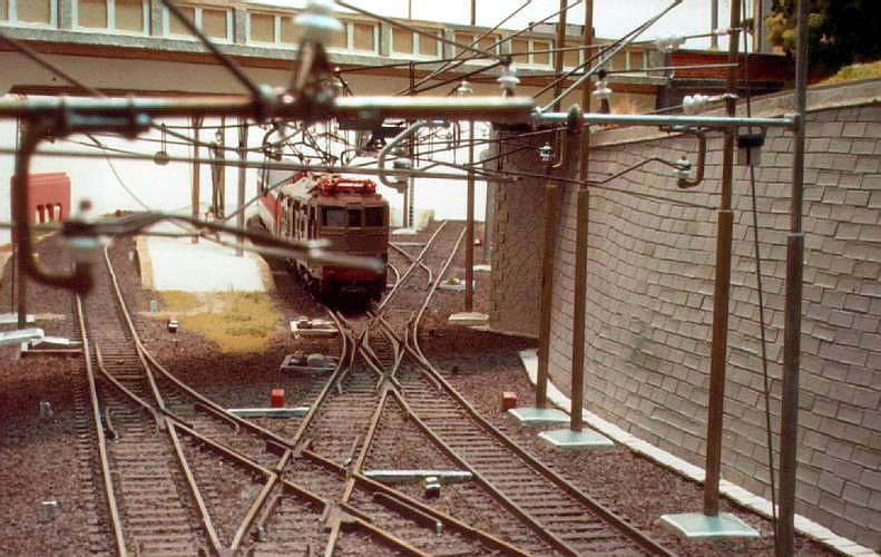 Il ponte sopra la ferrovia era studiato per nascondere la losanga che la linea aerea forma sopra gli scambi inglesi, che essendo abbastanza complicata da riprodurre decisi di non far vedere interamente. visto, però, che il lavoro venne benissimo, in modo del tutto uguale al vero, in seguito tolsi il ponte, che non mi piaceva molto a causa dell'interruzione che formava sulla scena.