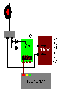 Il circuito di comando dei segnali, che in questo caso possono assumere solo due colori: rosso e verde, è molto semplice, e si compone essenzialmente del classico decoder e di un relè bistabile. Nello schema sottostante si vedono i pochi collegamenti necessari.